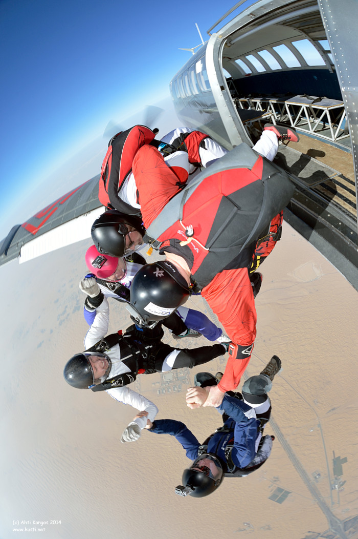 Skydivers launch a 5-way head-up formation from a PAC-750 over Dubai Skydive Desert Campus. Published in Parachuting Magazine in February 2015. Dubai 2014.