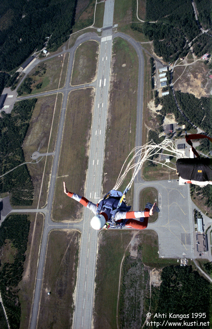 Static-line student over Jyväskylä airport. Jyväskylä 1995.