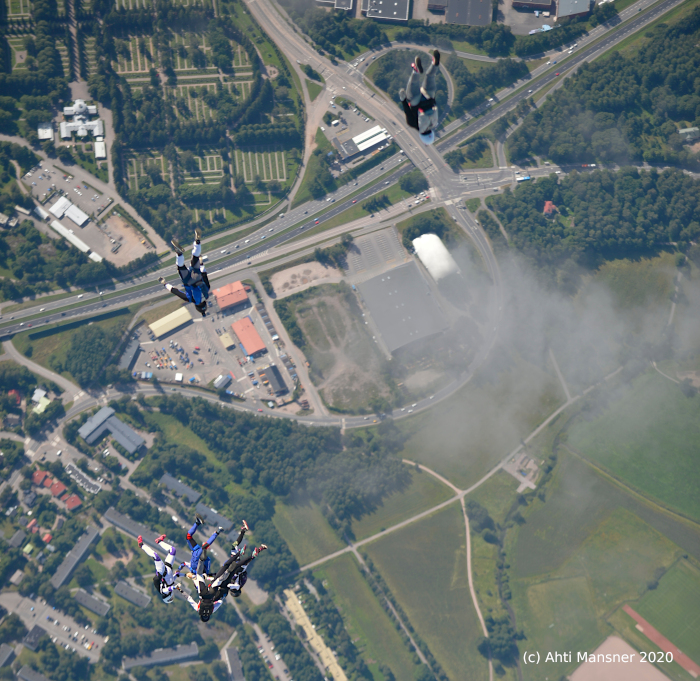 Skydivers building 6-way head-down formation @EFHF. Helsinki-Malmi 2020.